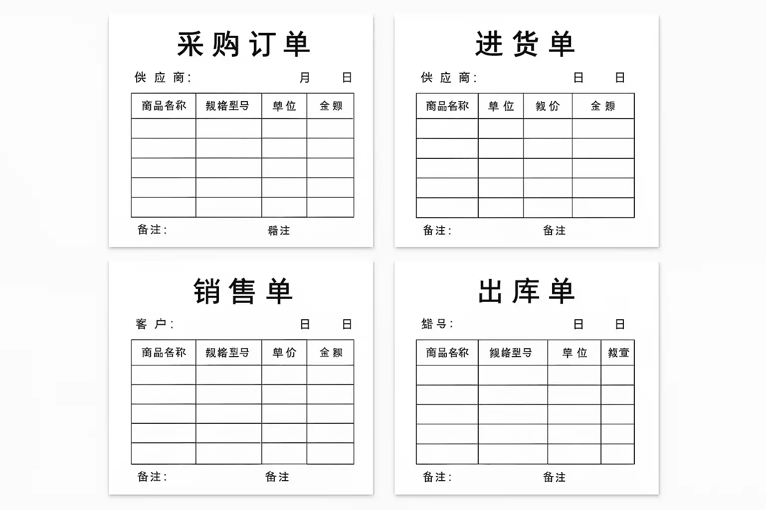 | 采购相关 | 采购申请单、采购订单、采购合同、采购入库单 | 用于规范采买流程,记录商品来源及数量价格 |