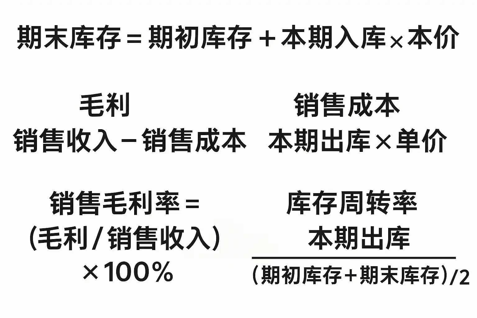 |目的|涉及公式||---|---||监控库存动态|库存余额、入库/出库统计||衡量资金效率|销售额、采购成本、利润||评估运营效率|库存周转率、毛利率|