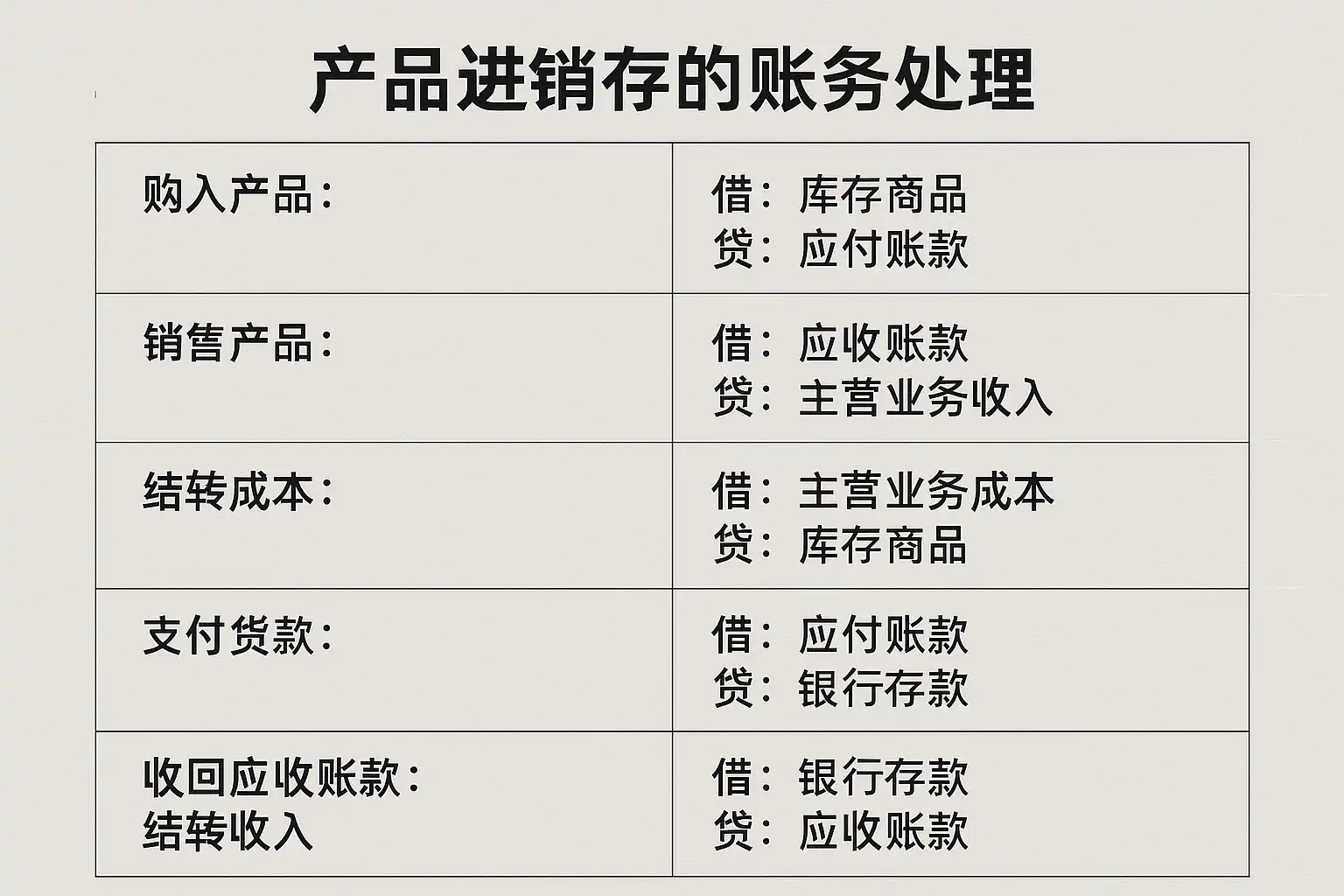 | 商品出库 | 仓储部门按订单拣货并登记出库 | 借:主营业务成本 贷:库存商品 |