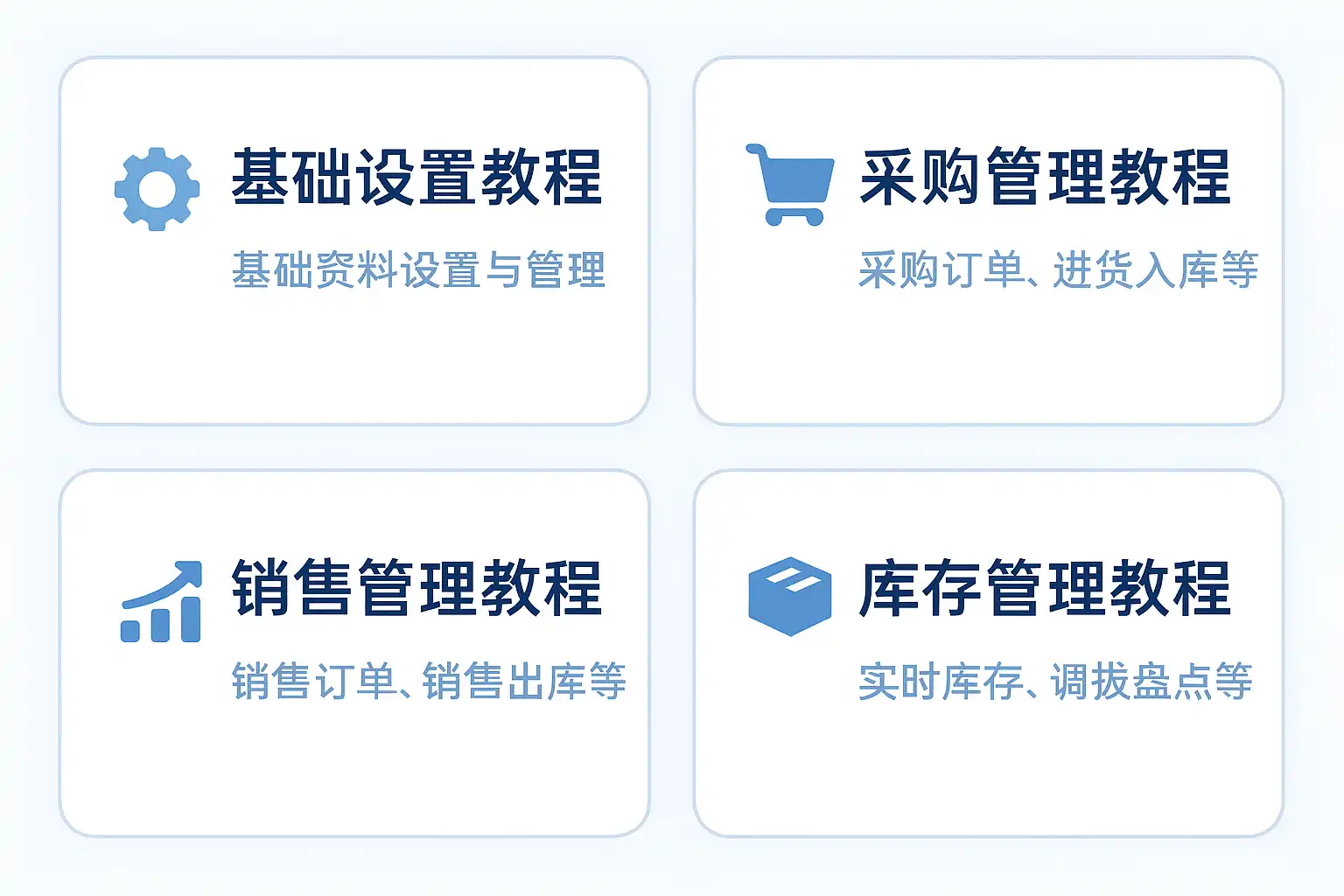 这些分类覆盖了绝大多数企业在实际运用过程中所需的全部知识点,无论是新手还是有经验的财务/仓储人员,都能通过学习相关模块快速上手并深入优化业务流程。