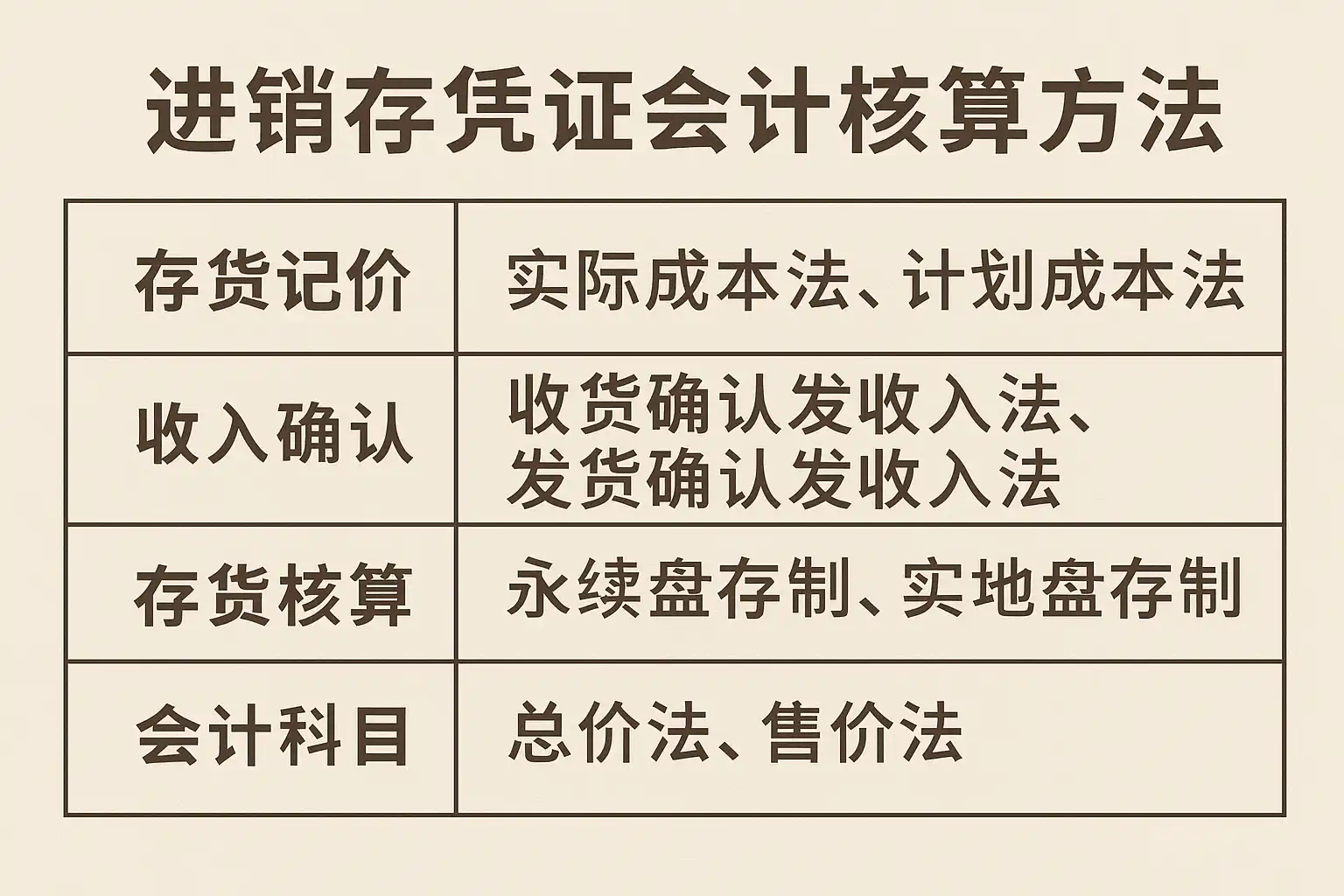 进销存(采购、销售、库存)凭证的会计核算,是指企业对商品采购、销售及库存变动等经济业务进行记录和归集的一系列操作。当前主流的会计核算方法主要有以下几种: