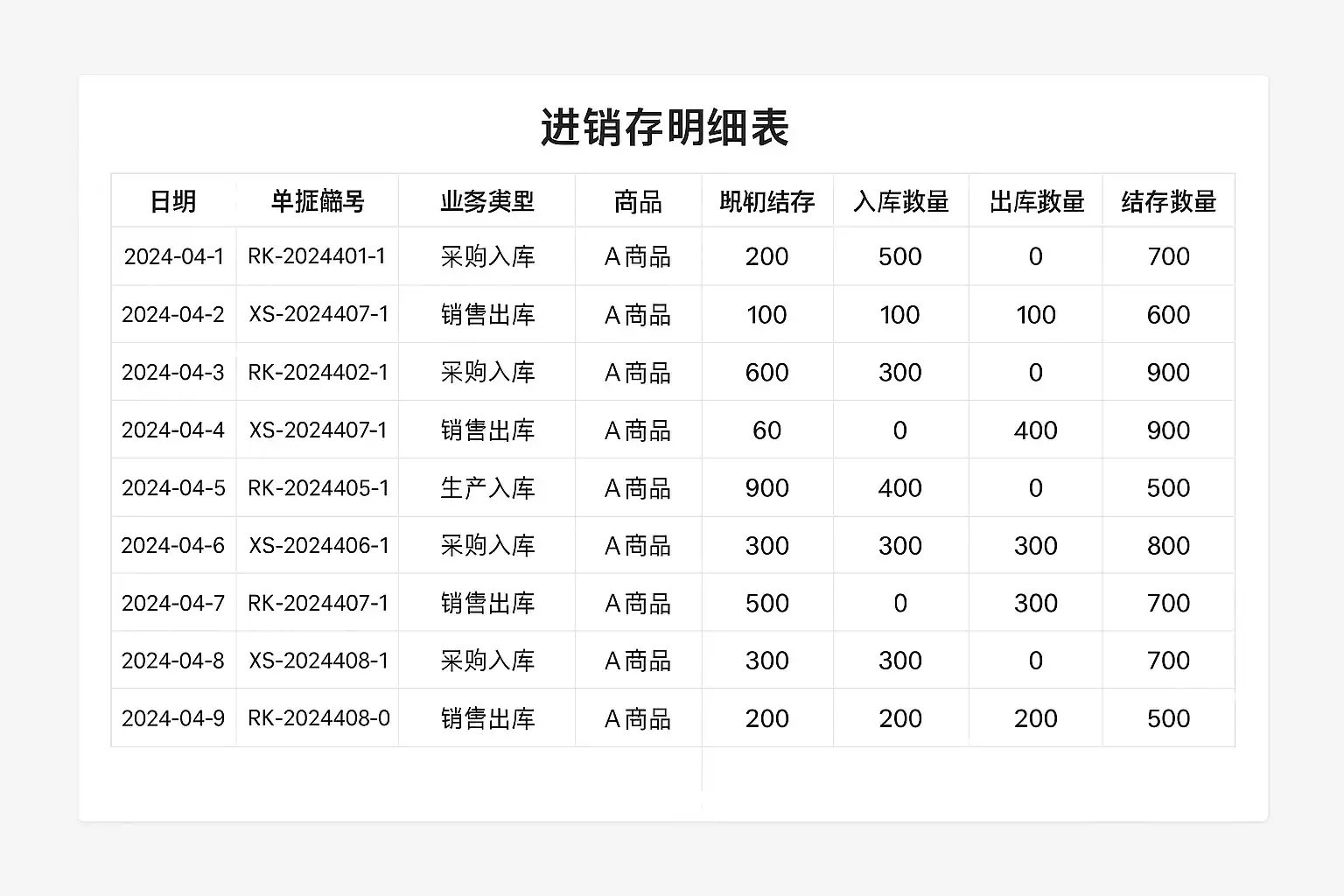 各类软件/平台对进销存明细表的呈现方式略有不同,下列表格对比了目前常见三种方式: