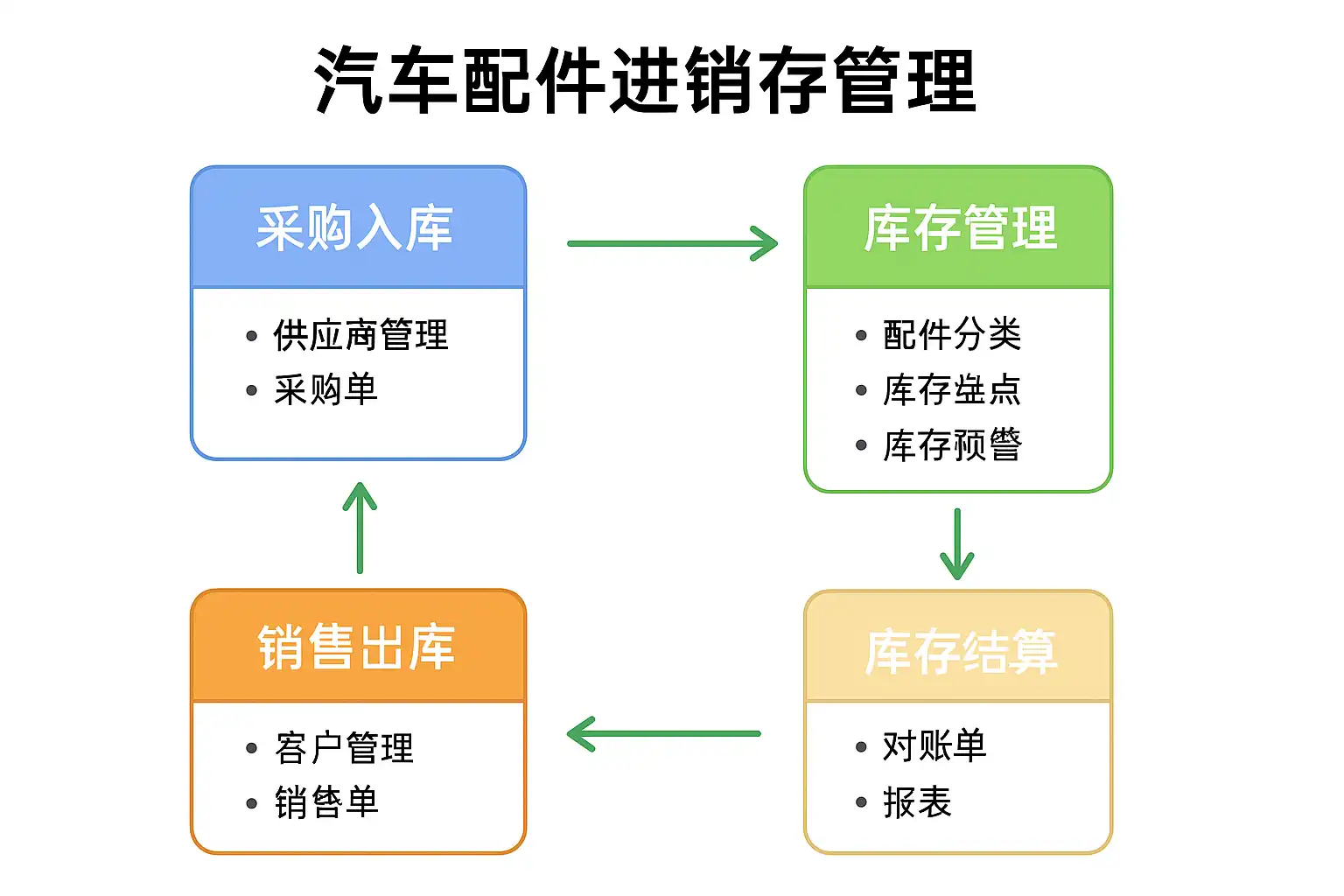 有效的汽车配件进销存管理涵盖以下几个核心环节: