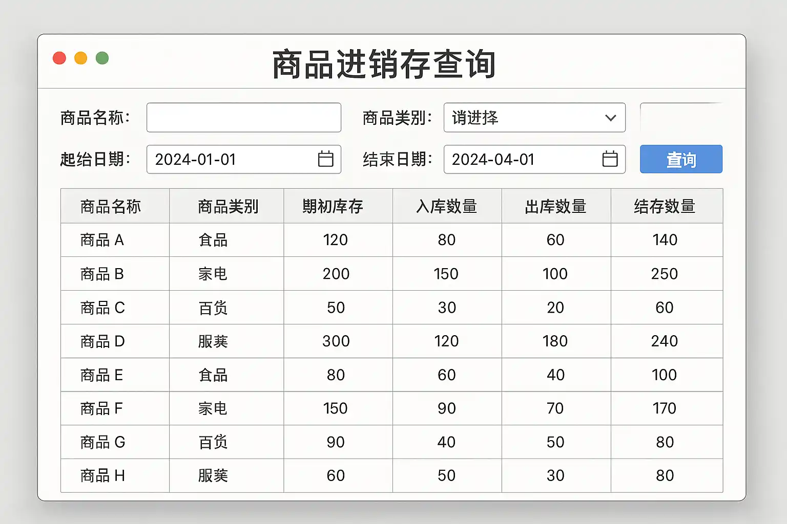 - 支持多条件查询(如按商品名称、批次号、日期区间等)。