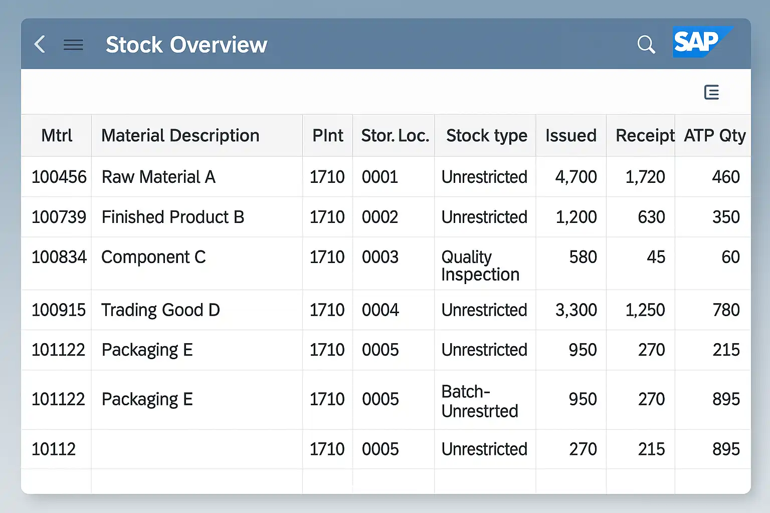 | MB52 | 库存清单 | 批量导出所有物料/储位当前库存 |