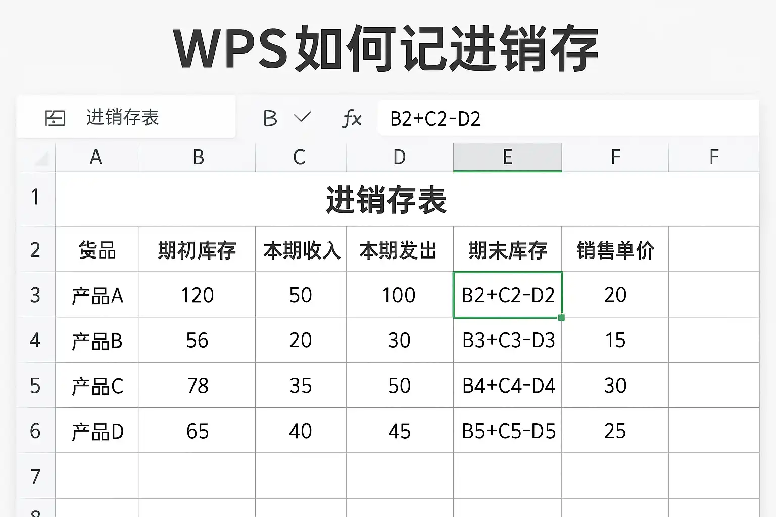 | 商品编码 | 商品名称 | 入库总数 | 出库总数 | 当前结余 ||------------|------------|-----------|-----------|-----------|| A10001 | 打印纸 | 500 | 300 | =C2-D2 |