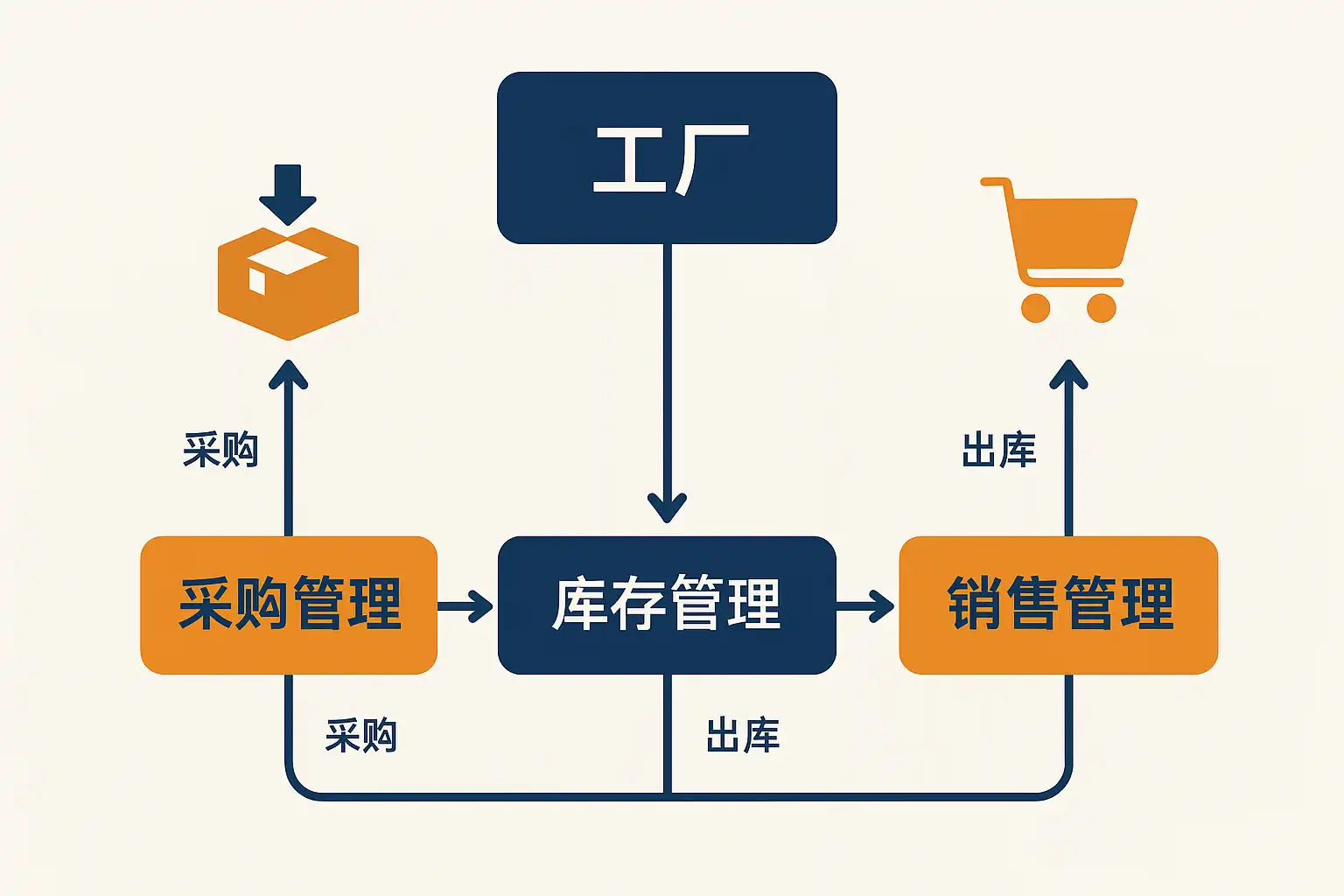 | 出库 | 发货出库登记 | 库存扣减、物流对接 |