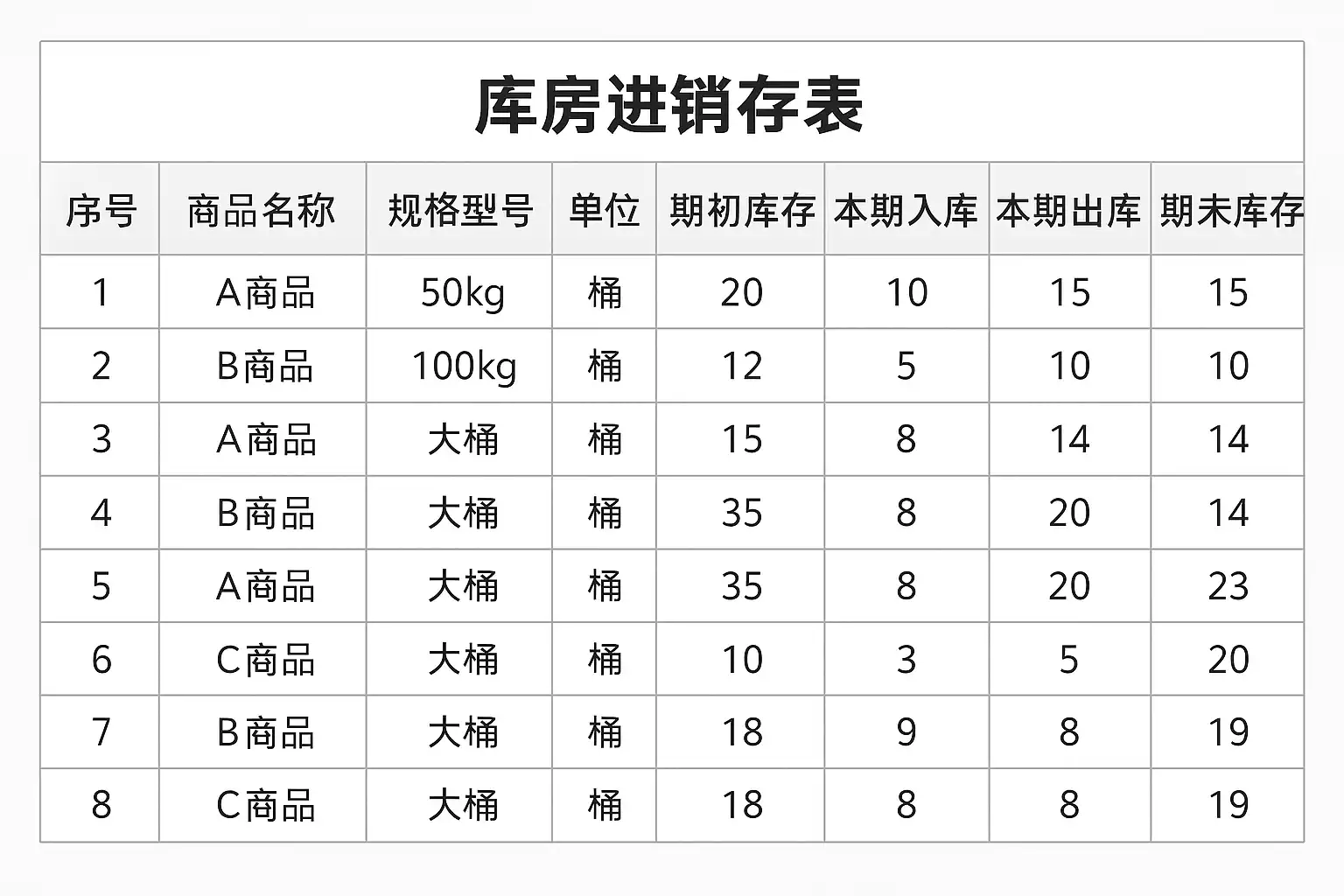 一个标准的库房进销存表格需要涵盖哪些内容?合理结构能够提升信息流转效率,减少遗漏和误差。下表为常用字段设计参考: