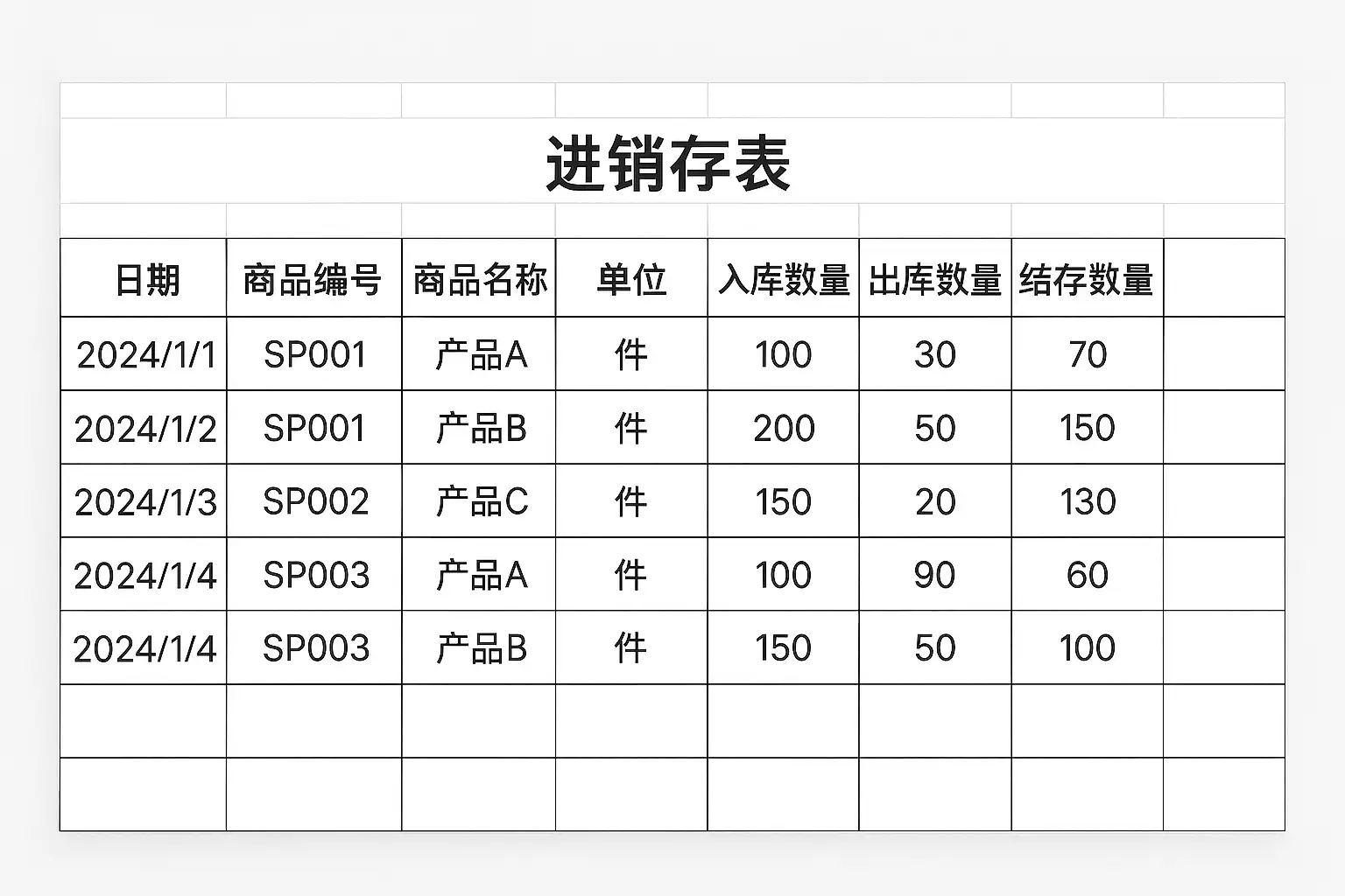 | 库存汇总 | 编号、期初数、本期入、本期出、本期结余 | 自动统计每个商品实际库存 |