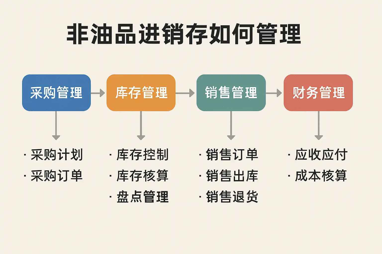 非油品(如便利店商品、快消品、小百货等)与油品相比,SKU数量更多,流转速度快,对精细化管理和响应速度要求极高。有效的非油品进销存管理应涵盖以下核心要素: