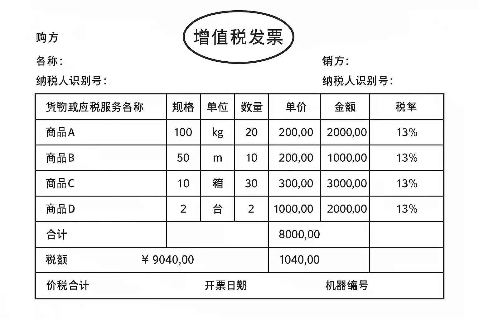 - 增值税专用发票:用于一般纳税人之间可抵扣进项税额的大宗交易。