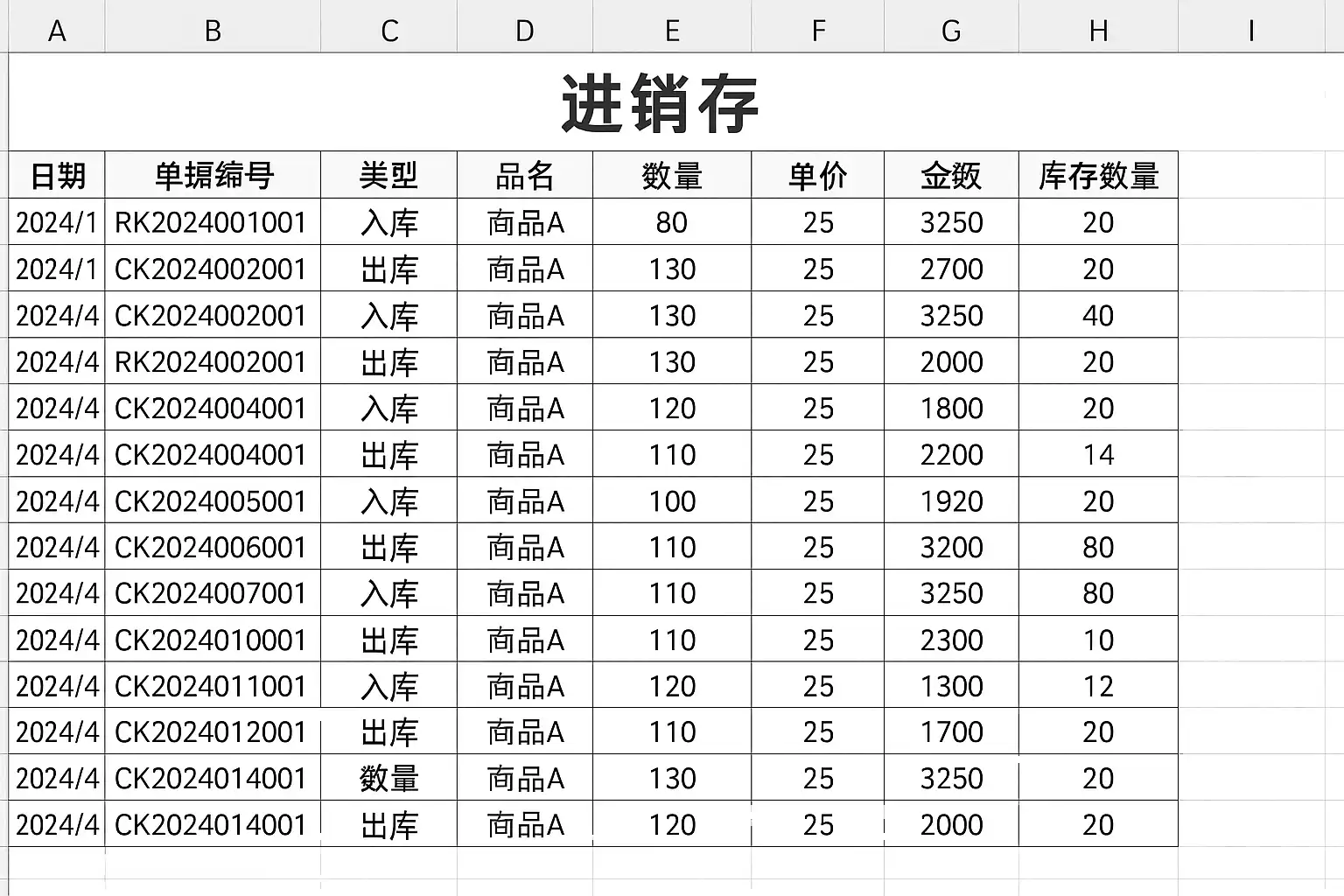 | 库存汇总表 | 商品编号、本期初始库存、本期入库、本期出库、本期结余 | 汇总各品种实际库存情况 |