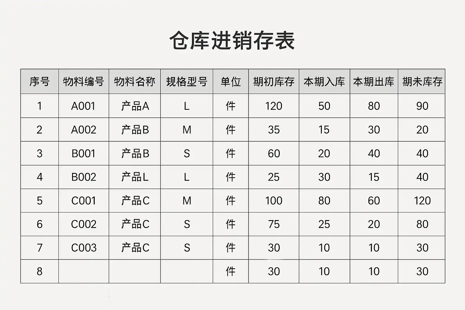 - 库存余额计算:通过公式动态计算实时库存,常用公式为“期初库存 + 入库总量 - 出库总量 = 期末库存”。