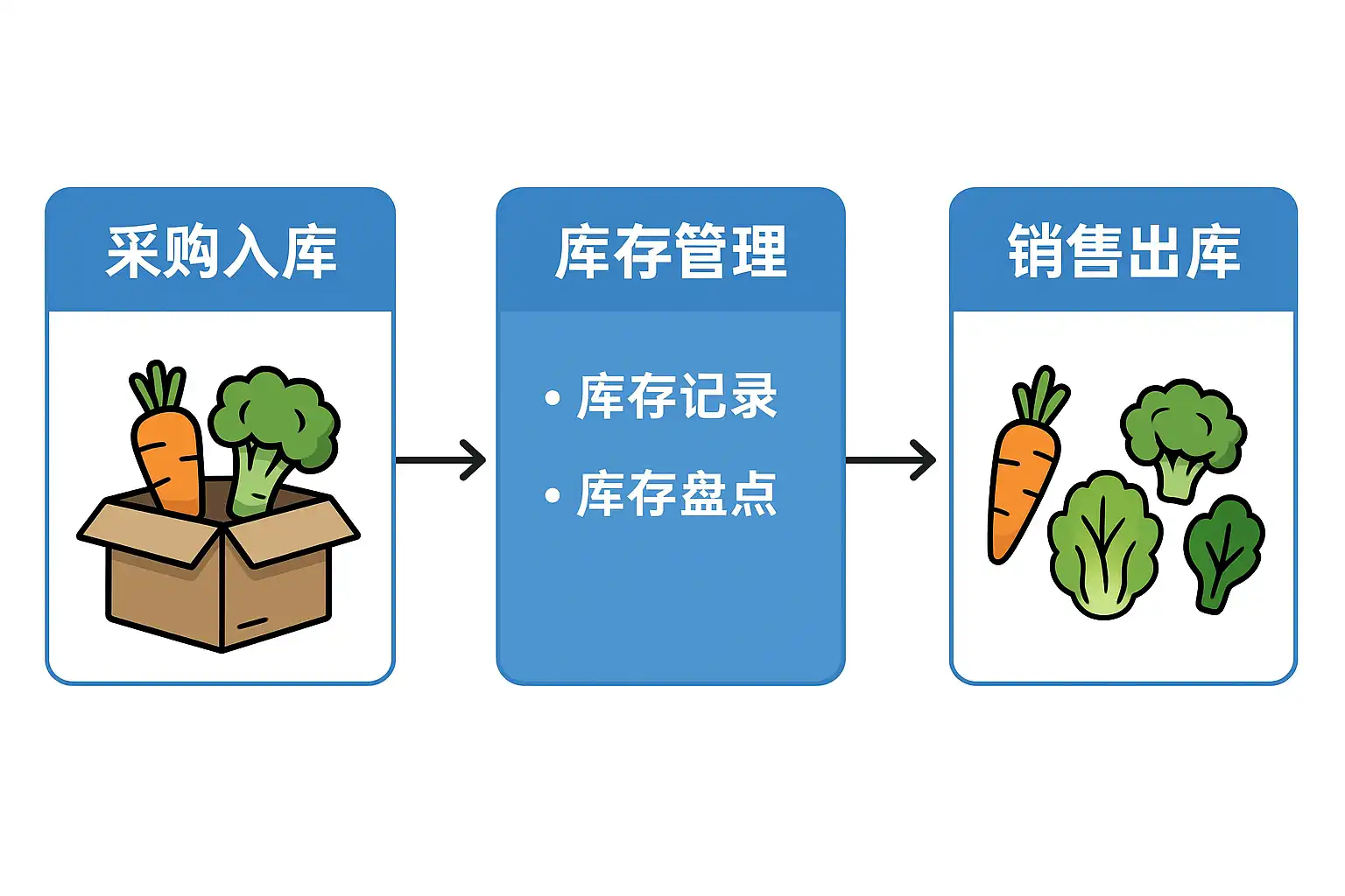 蔬菜进销存管理的核心流程包括采购、入库、库存管理、销售及出库五大环节。具体步骤如下: