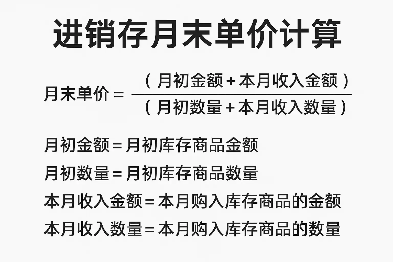 | 4. 计算平均单价 | 用(期初金额+购入金额)÷(期初数量+购入数量)得新单价 |