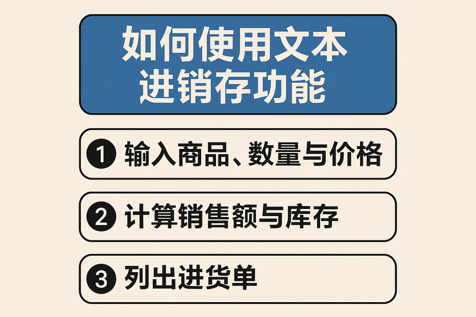 文本进销存功能是指通过文本格式管理商品的采购(进货)、销售(出货)和库存信息的一种系统方法。它通常用结构化的文本数据来记录和跟踪商品流转,方便企业实时了解库存状态。例如,一个服装店可以使用文本进销存功能,通过每天录入销售和采购数据,实现对库存数量的精准控制。根据统计,使用文本进销存系统的企业库存准确率可提升至95%以上,有效减少缺货和积压。