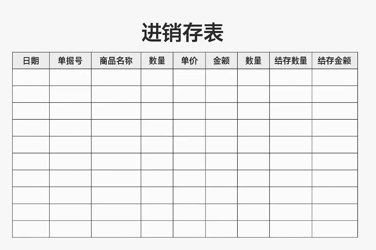 | 日期 | 单据类型 | 单号 | 商品编号 | 商品名称 | 入库数量 | 出库数量 | 单价 | 金额 | 库存结余 |