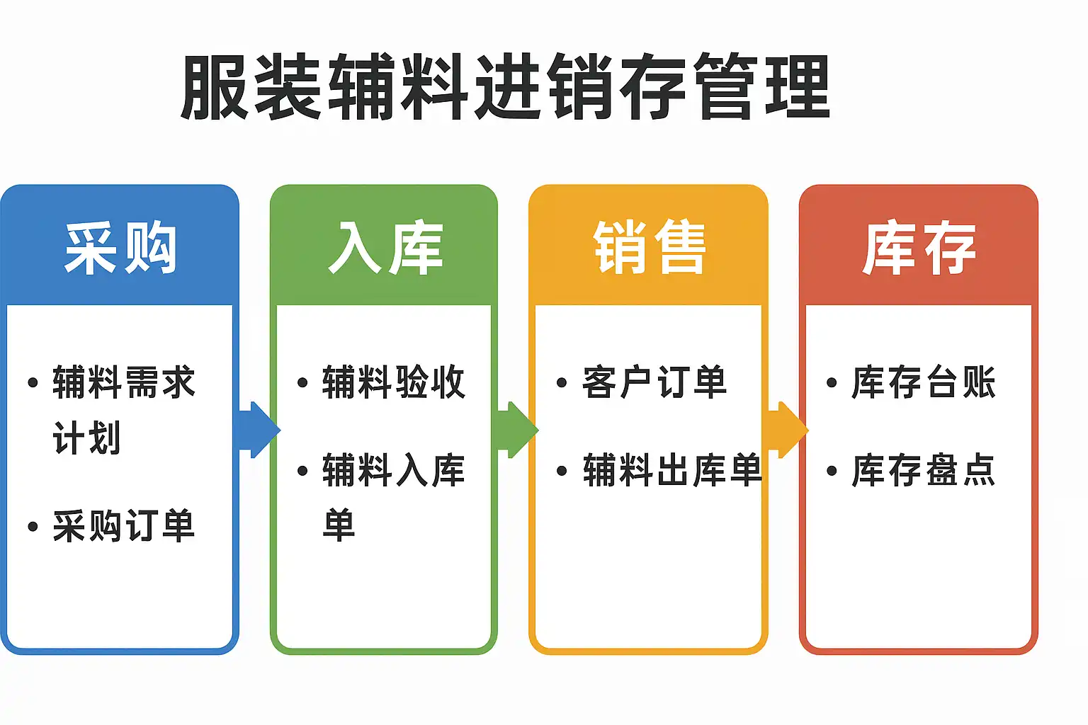 服装辅料进销存管理的核心流程主要包括采购、入库、库存管理和销售出库四个步骤。具体如下: