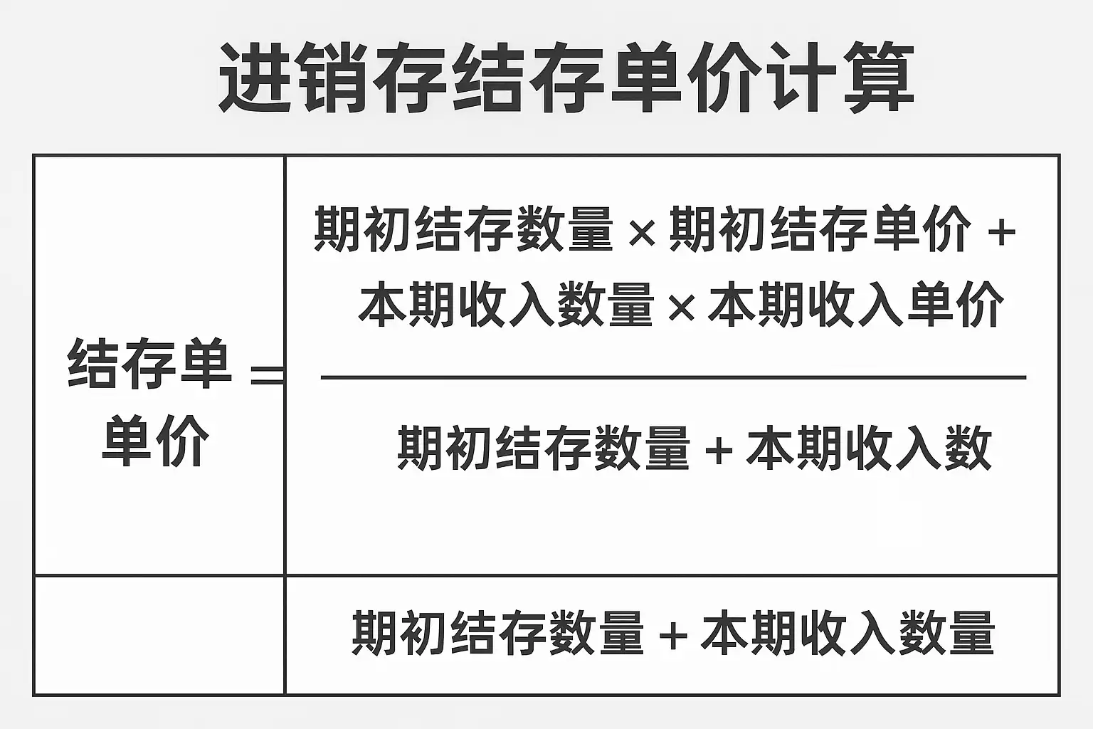 - 公式:结存单价 = (期初库存金额 + 本期购入金额) / (期初库存数量 + 本期购入数量)
