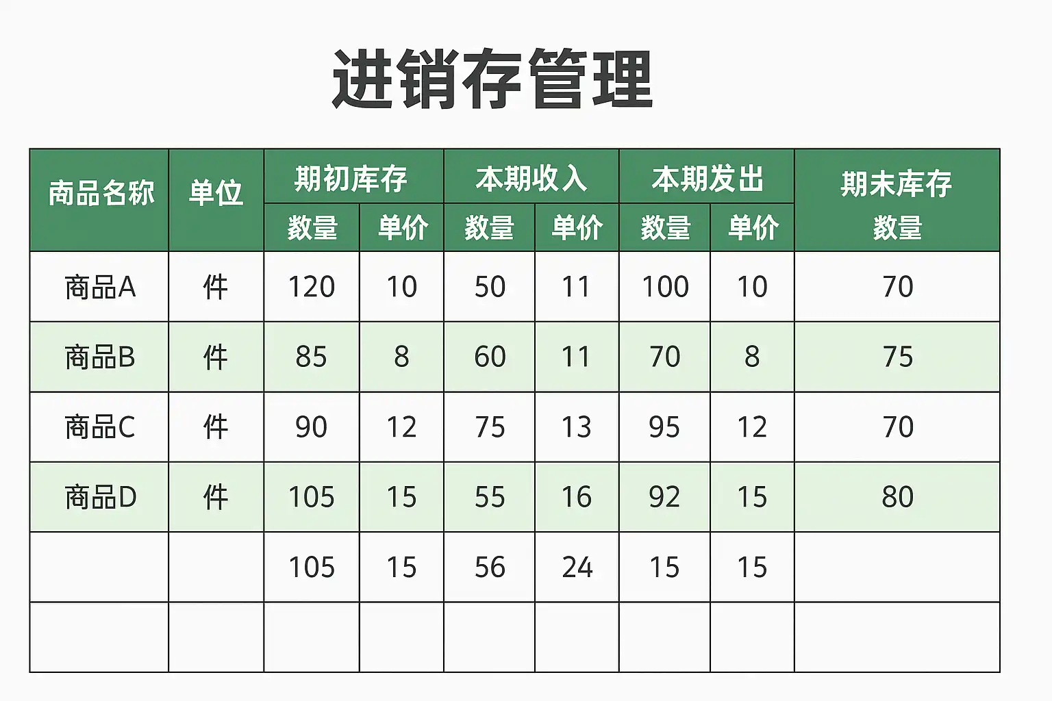 | 商品编号 | 期初数量 | 本期入库 | 本期出库 | 结余库存 |