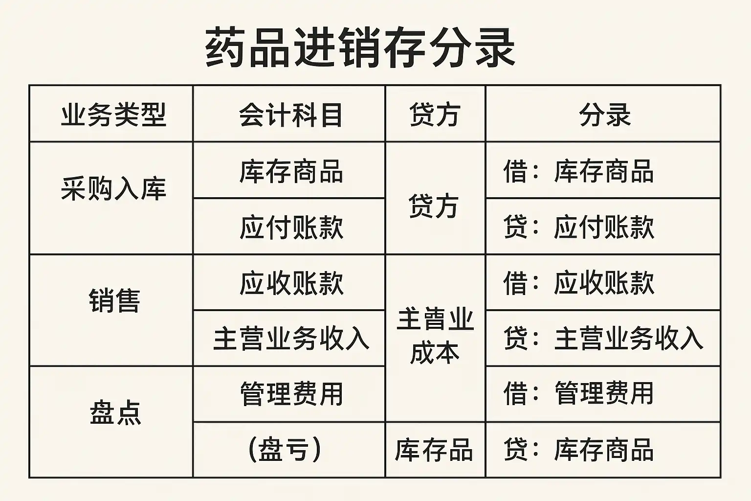 | 药品入库 | 库存商品 | XXXX元 | 应付账款 | XXXX元 |