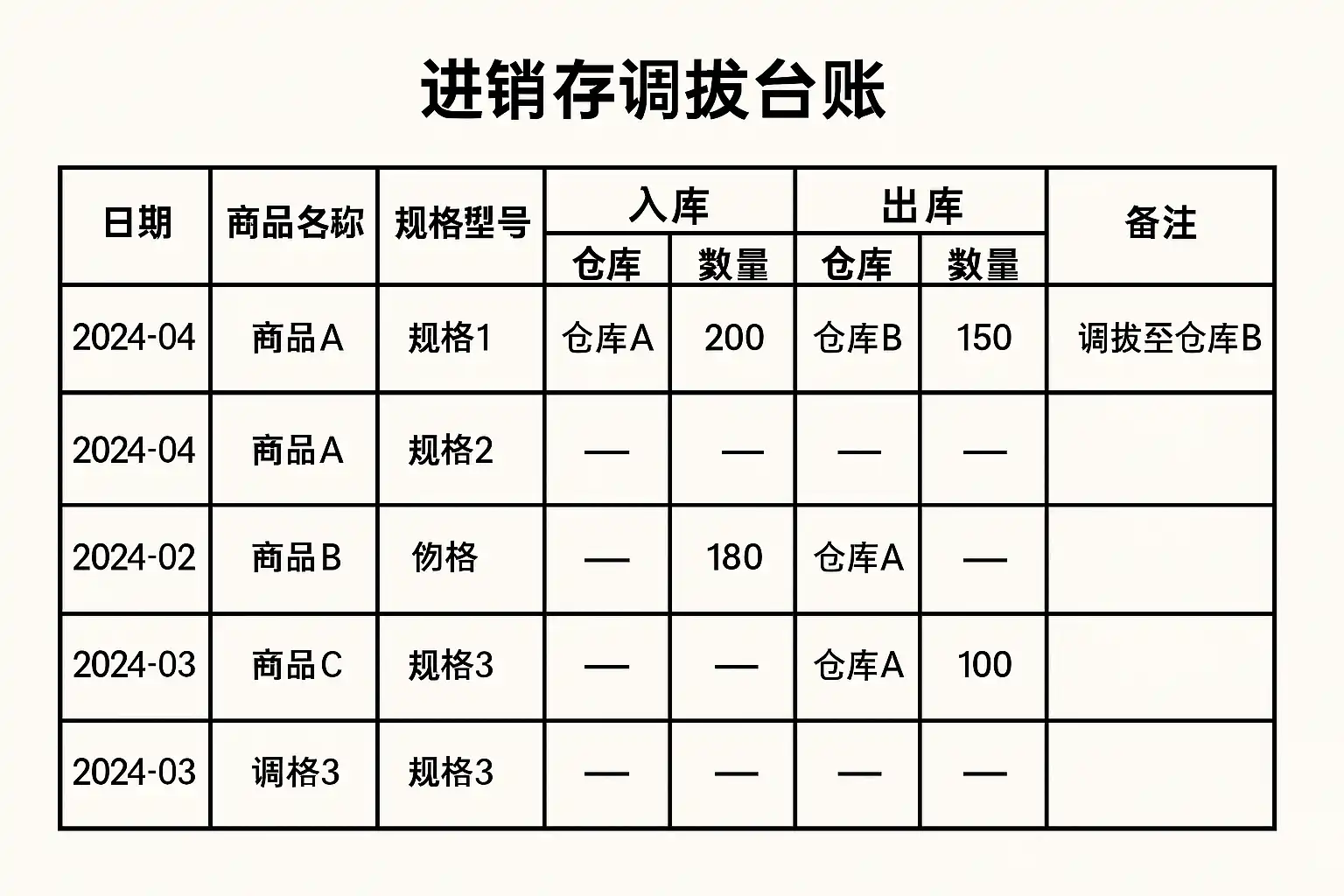 进销存调拨台账是记录商品在不同仓库间调拨情况的详细账簿,帮助企业实时掌握库存流转。准确建立台账需遵循以下步骤: