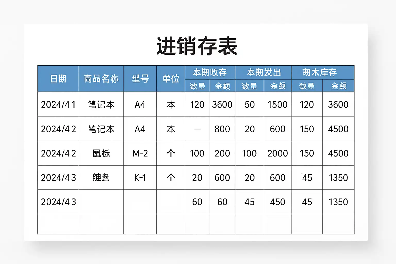| 2024-06-02 | A0001 | 手机 | S23 | 台 | XX客户 | 50 | =上一行库存+当前行进-当前行出 |
