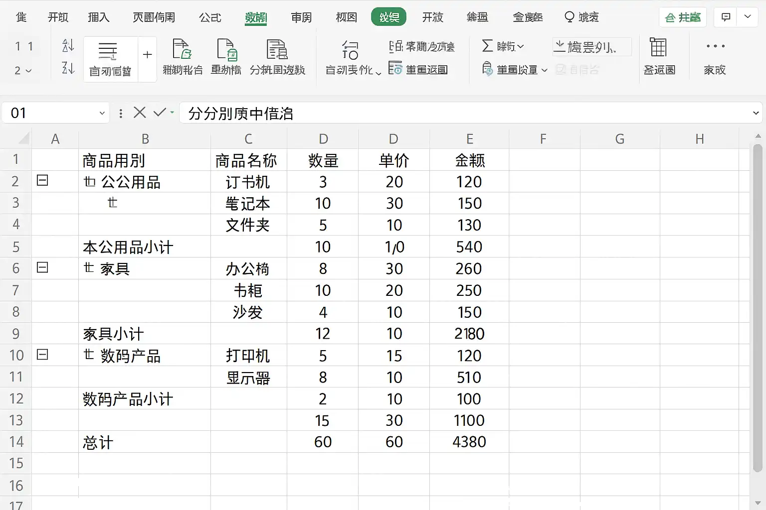 - 数据未排序:必须先按要分组的字段排序,否则分类汇总结果会错乱。