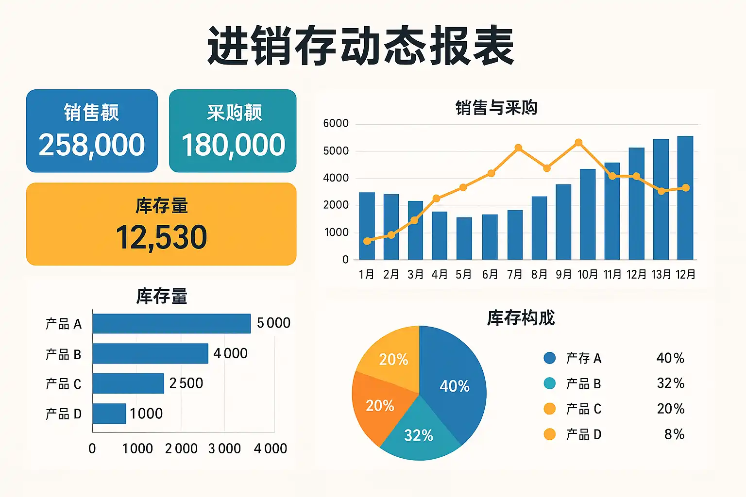 - 设计可交互的仪表盘,展示关键指标如库存余额、销售额及采购成本。