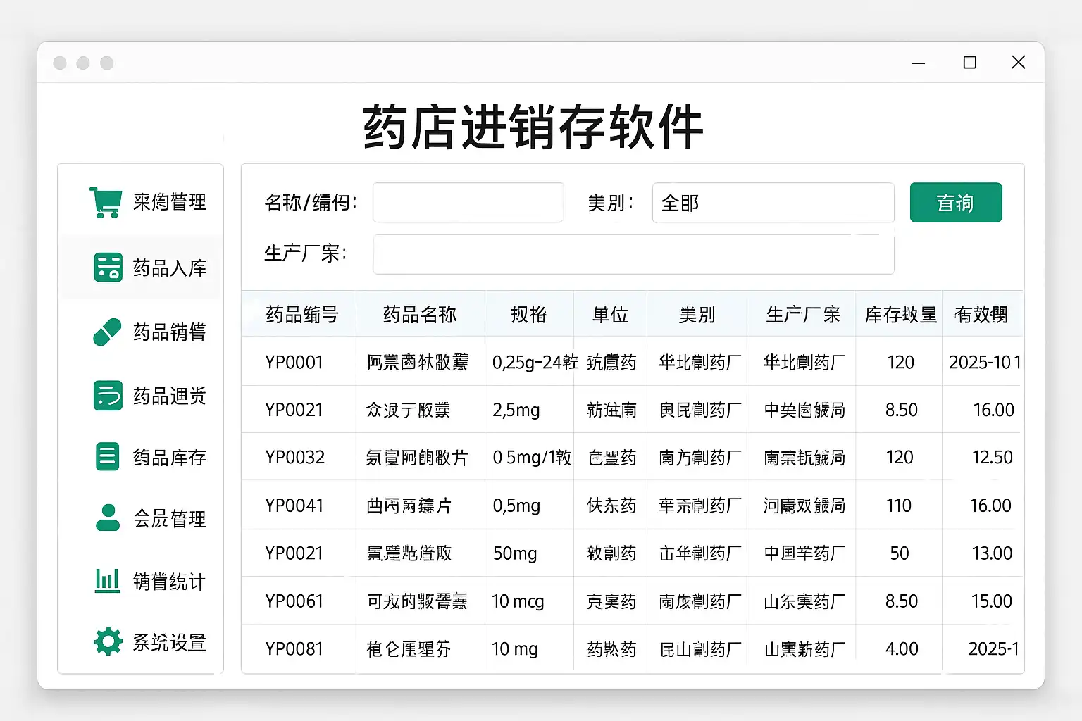 | 库存预警设置 | 自动提醒低库存或过期药品 |