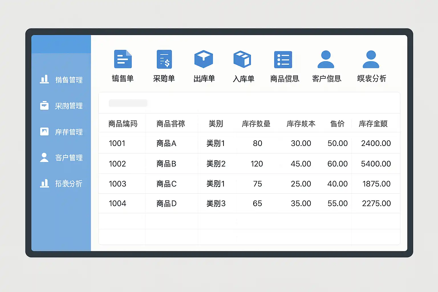 - 模块化设计:分步引导完成采购、销售、库存操作。