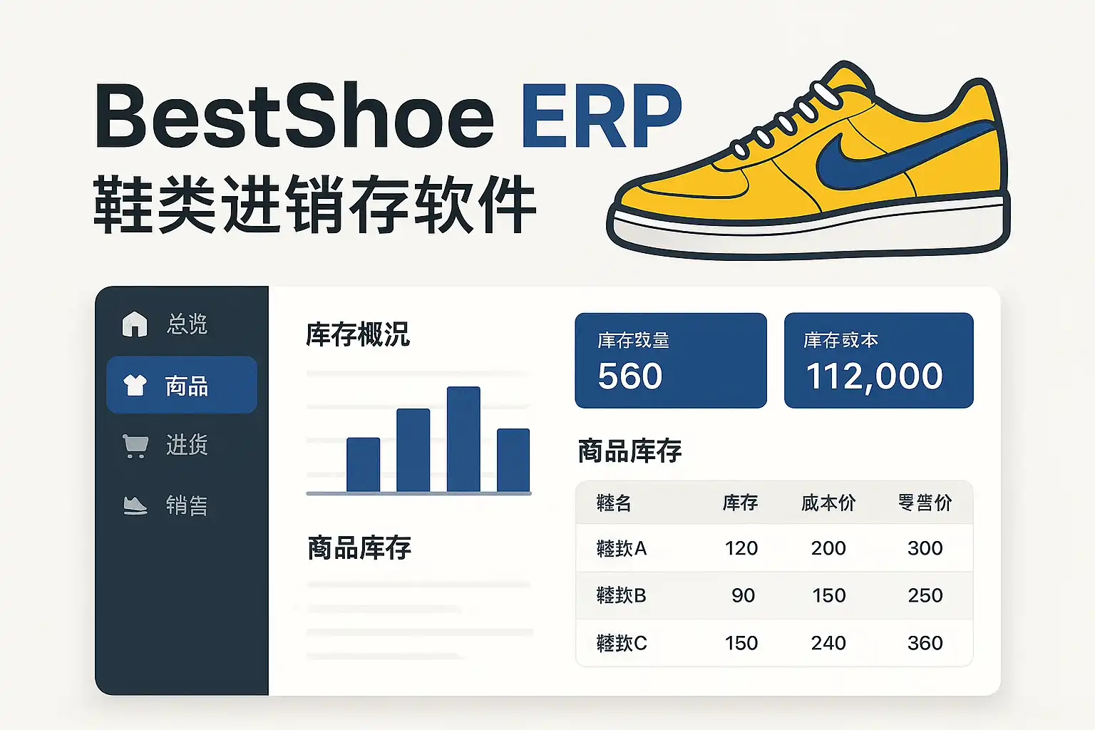 | 多尺码库存管理 | 鞋子有多种尺码,需要精细化库存控制 | 支持自动补货提醒,避免断货 |
