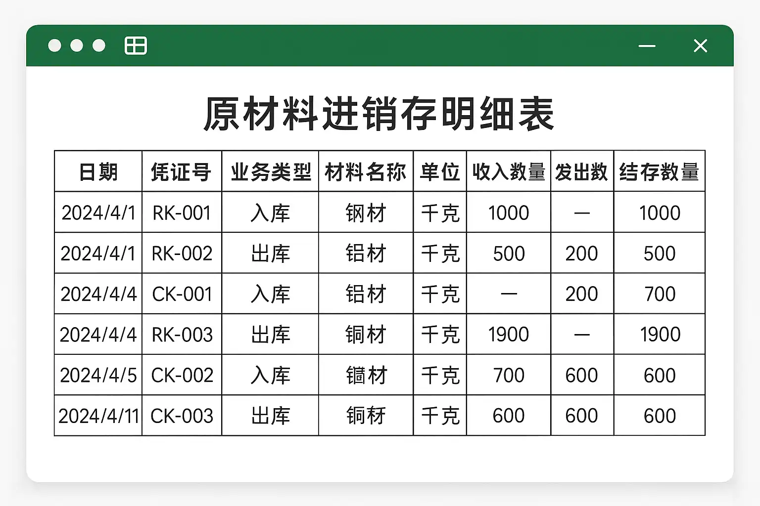 针对制造业、电商贸易及传统工厂的日常需求,一款好的原材料进销存明细表应涵盖如下模块: