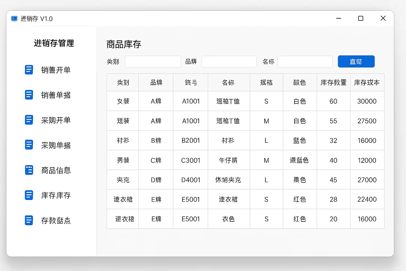 - 包含采购入库、销售出库(扫码/批量)、退换货登记、多规格商品管理;