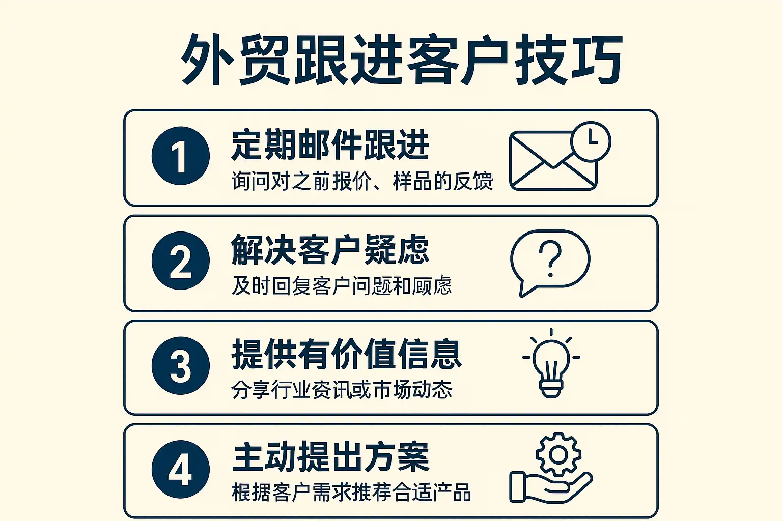 频繁而有节奏地与客户保持联系,是促成外贸订单的重要手段。优质企业普遍会设立周期性的回访与触达计划。
