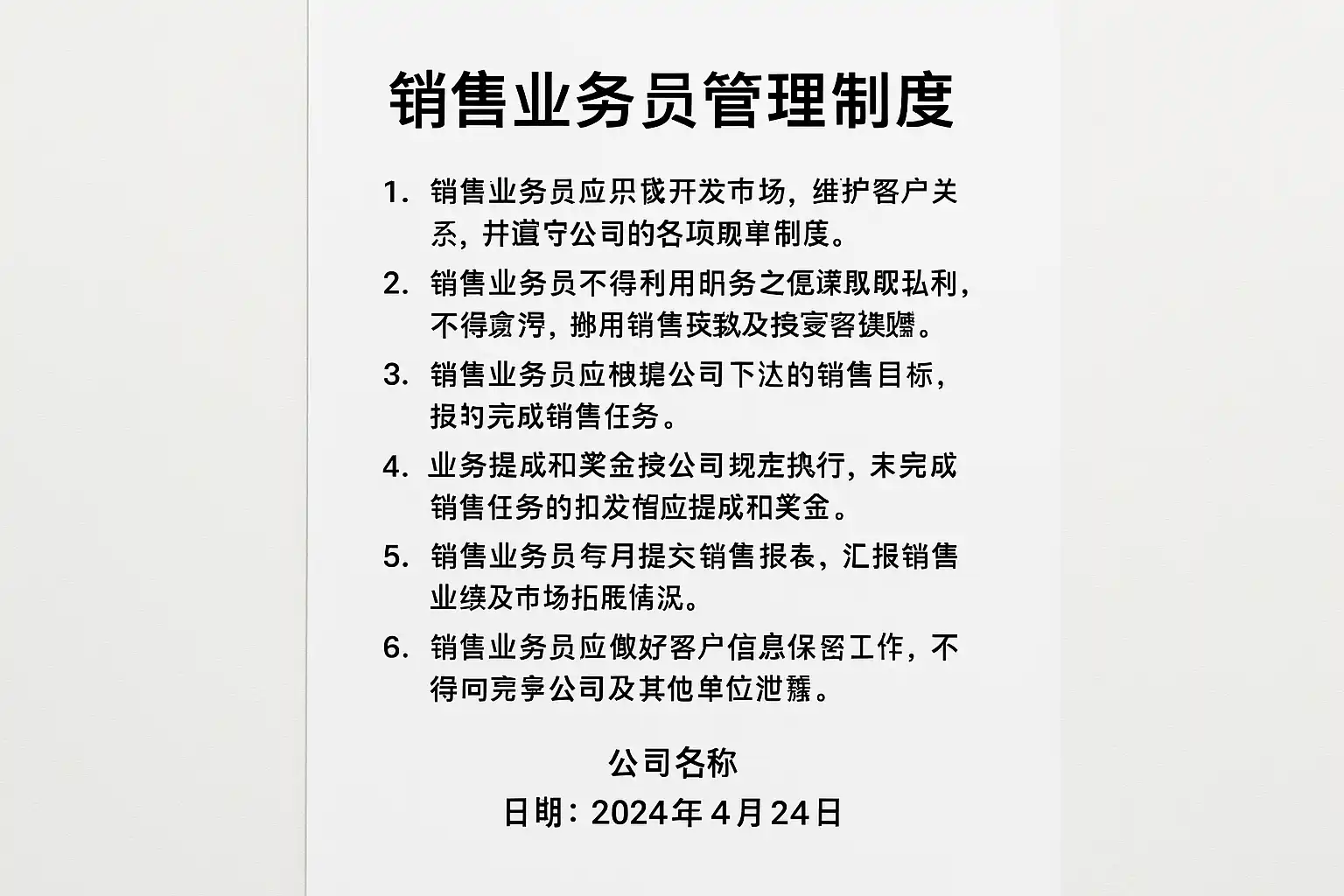 一、销售业务员管理制度的核心内容