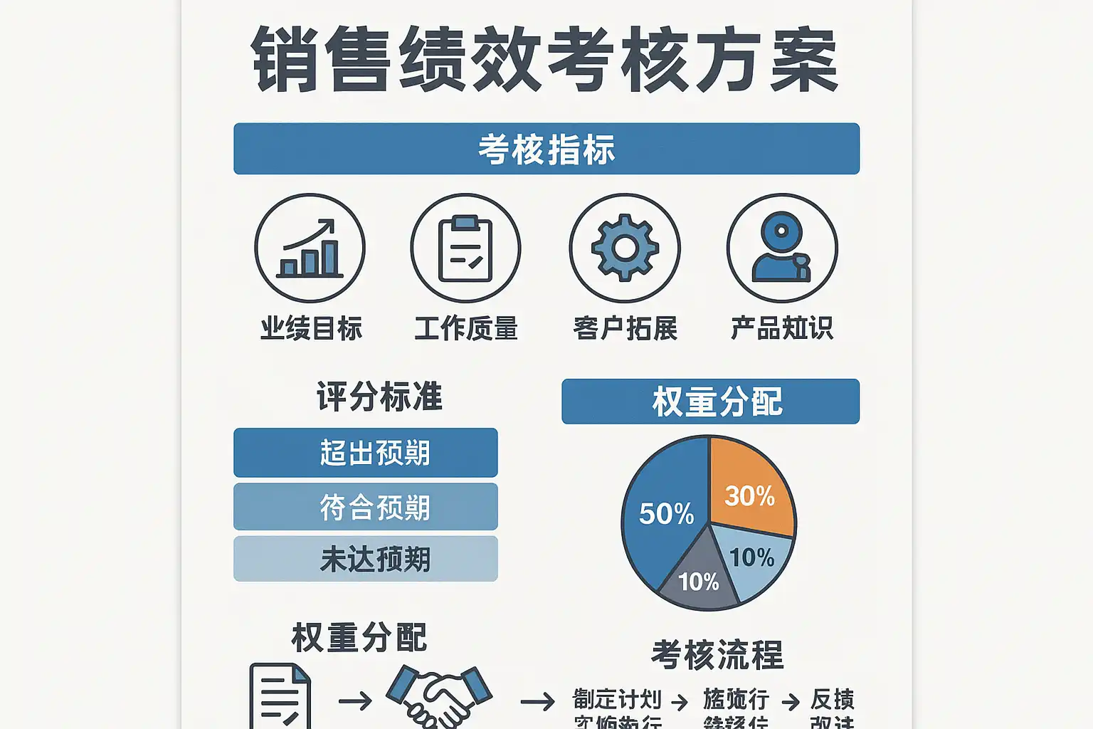 销售绩效考核方案是一套系统化评估销售人员业绩的标准和流程。关键指标通常包括: