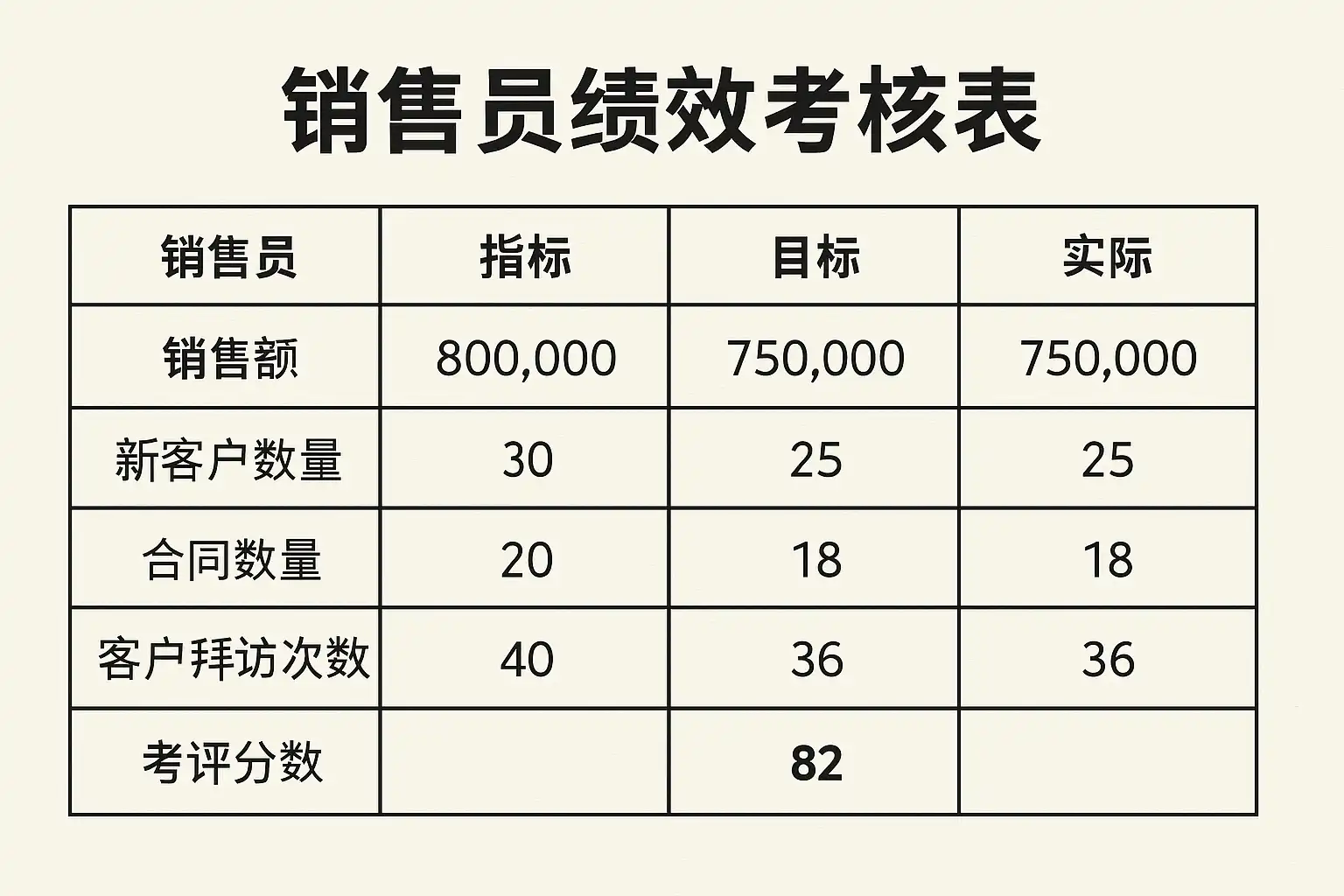 通过以上指标构建结构化的绩效考核表,可以科学、全面地评估销售员的综合表现。