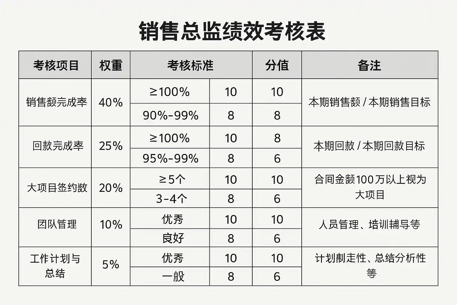 - 高管级别(如销售总监):应加入团队管理与人才培养等软性评价维度。