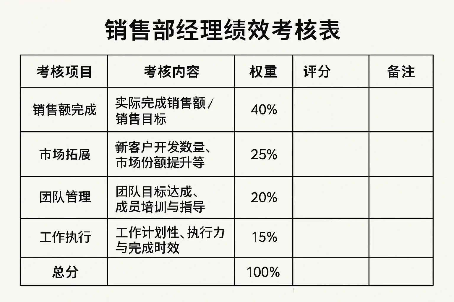 | 1. 基本信息 | 被考核人姓名、岗位、部门、考核周期等 | 张三,销售部经理,Q1 |