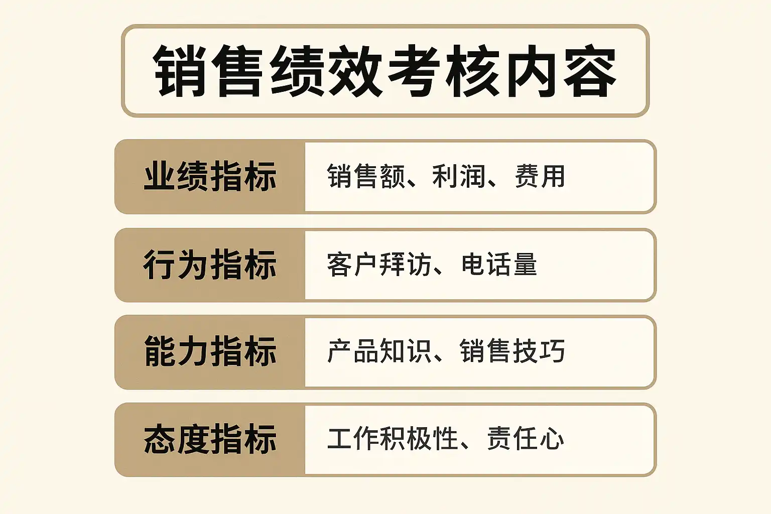 设计销售绩效考核内容时,可以采用结构化布局分为三大层级: