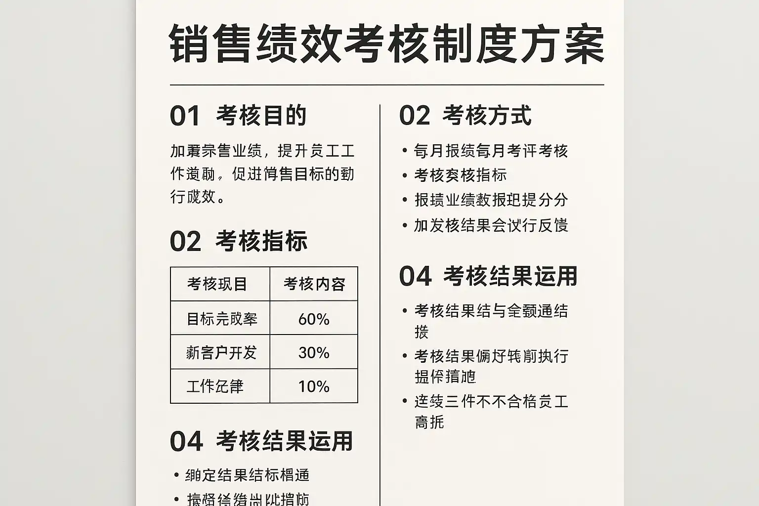 有效的销售绩效考核制度方案应包含明确的KPI指标、合理的权重分配以及及时反馈机制。通常包括销售额、客户满意度和新客户开发数等指标。例如,某企业引入基于目标完成率的评分体系后,团队月均业绩提升了15%。通过结构化考核和激励措施相结合,可以显著提升团队积极性和业务成果。