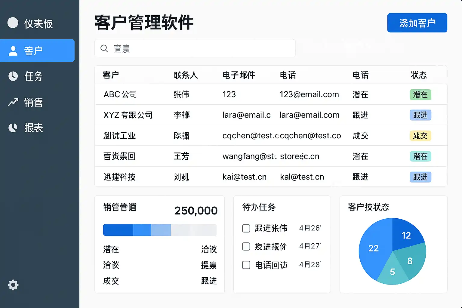 客户管理软件(CRM, Customer Relationship Management)是一种用于收集、存储、分析及利用客户相关数据的软件系统。它致力于帮助企业更有效地开发潜在客户、维护现有用户,并通过数据分析优化销售与服务过程。