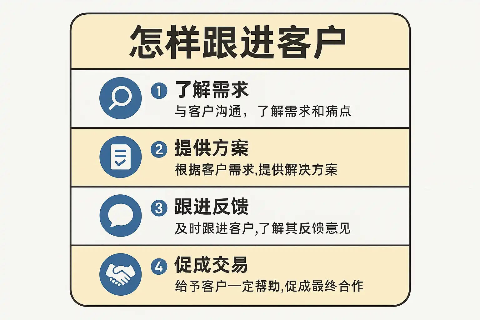 - 制定分阶段跟进策略(初次联系-需求确认-方案推荐-成交推动)。