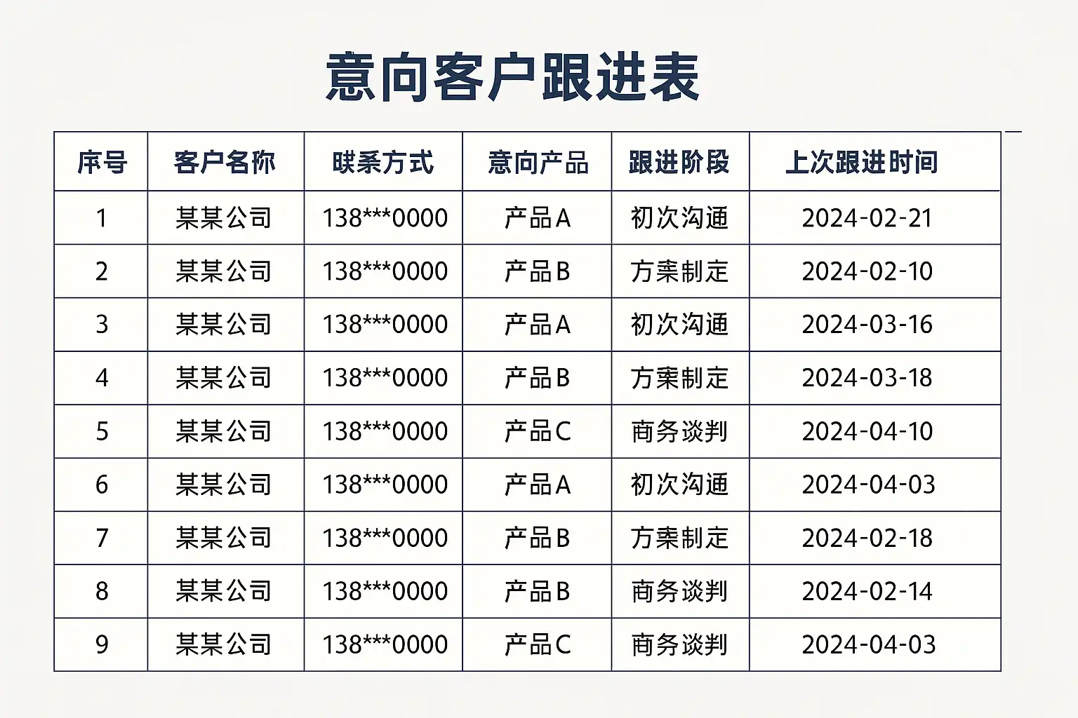 设计高效的意向客户跟进表应包含以下关键字段: