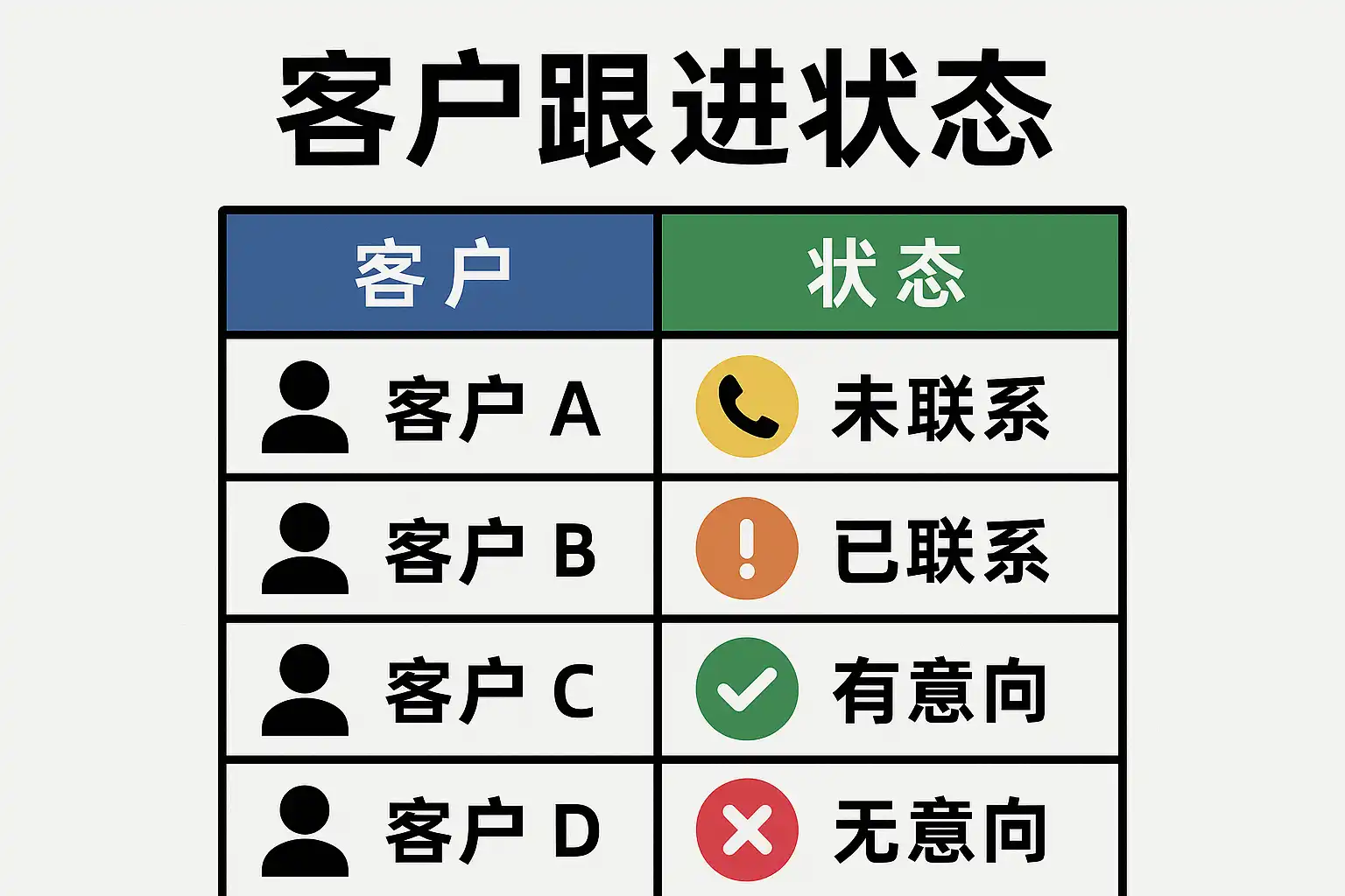 - 客户跟进状态是企业销售管理的重要环节,用以标记每位潜在或现有客户的业务推进阶段。