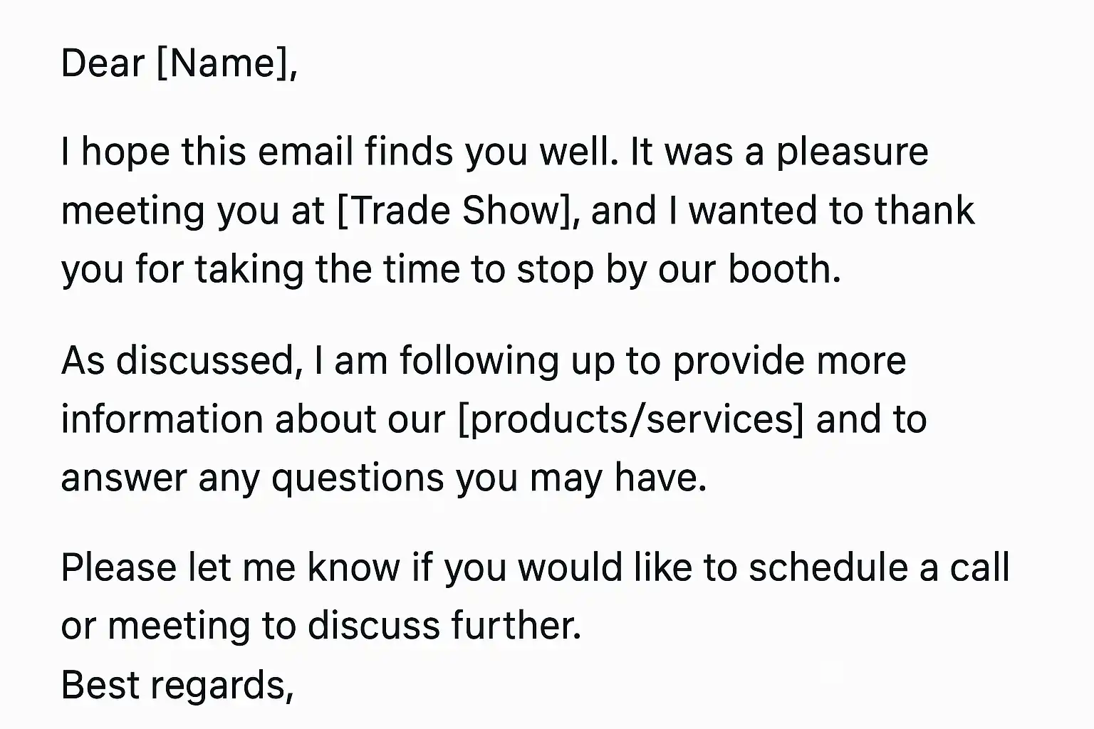 - 使用行业相关词汇,如“trade show follow-up”、“business opportunity”。