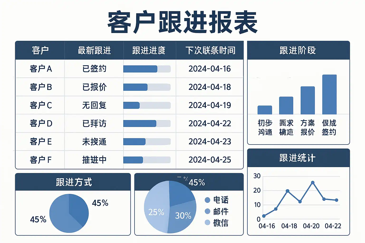 不同企业和行业会根据自身需求设计适合自己的跟进报表。但标准的客户跟进报表通常应包含以下主要内容: