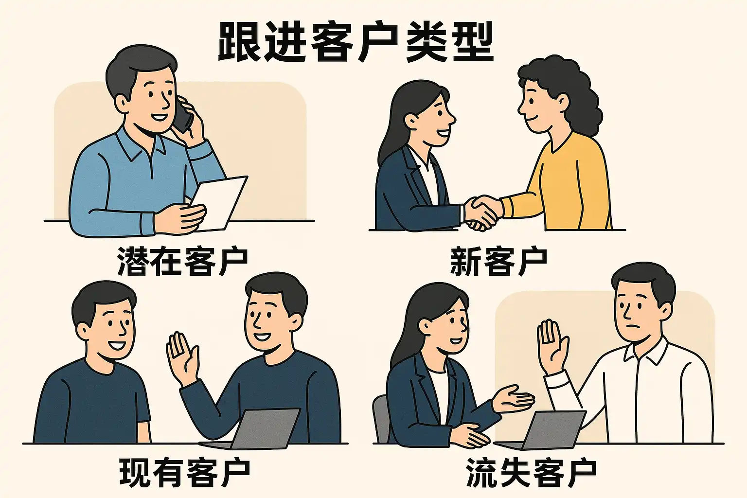 针对上述各类客户,要采取差异化且高效的方法进行跟进。以下是常见方法建议: