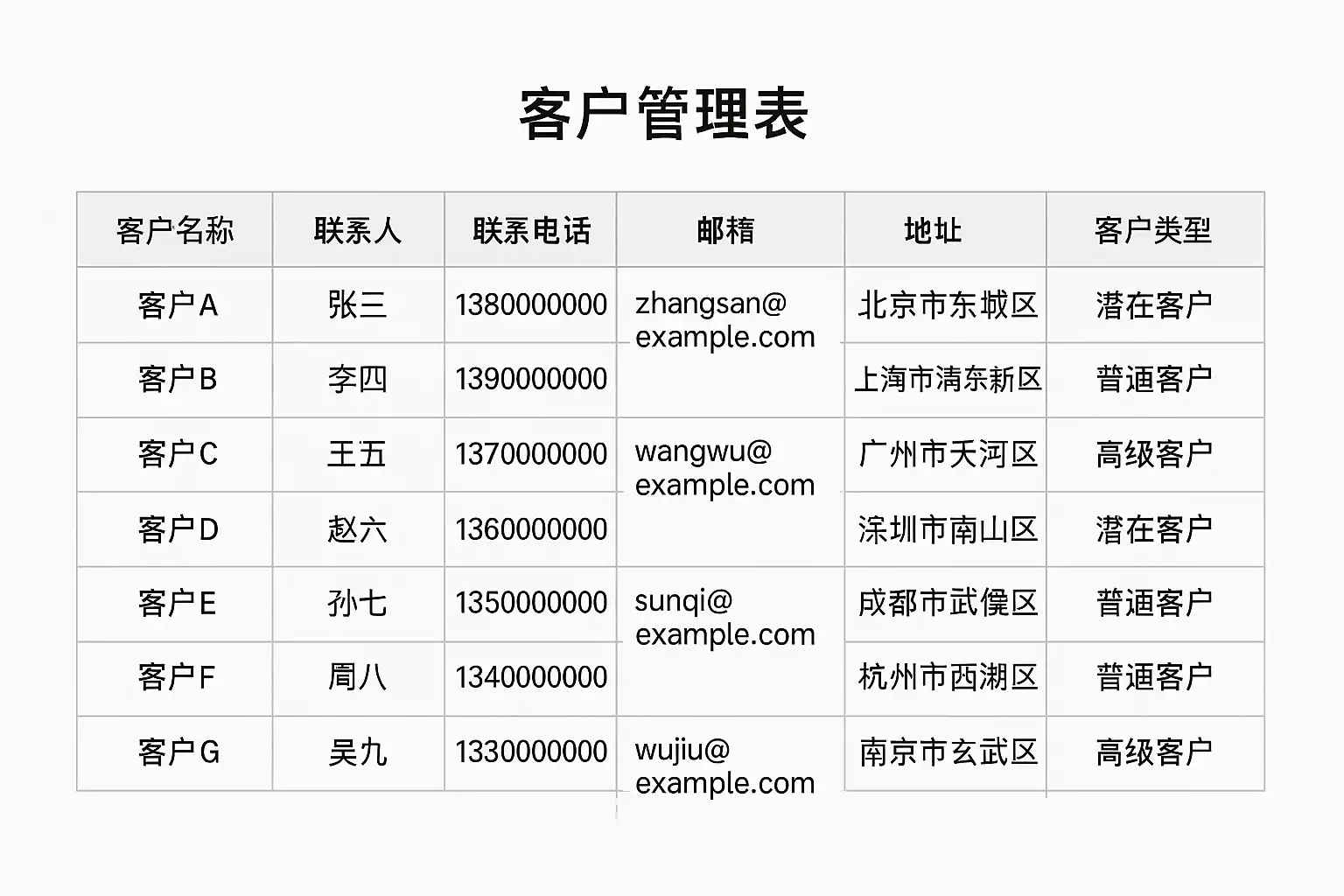 下面以结构化方式展示一个典型的客户管理表模板: